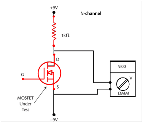 Take a 9-volt battery and a 1-kΩ resistor and connect them as shown in Figure . Set your DMM to read voltage, and connect it across the drain and source of the FET. Leave the gate terminal unconnected. Touch two of the fingers of one hand between the gate and drain terminals momentarily. The voltage shown on the meter should drop quite a bit and stay at the lower value after you release your fingers. This indicates that the gate of the FET is positively charged and is turning on the drain-to-source path, as it should. Now, touch your fingers between the gate and source terminals and let go. The voltage should rise back up to the battery’s voltage and stay there because you’ve discharged the gate. If you get these behaviors, the part is good.